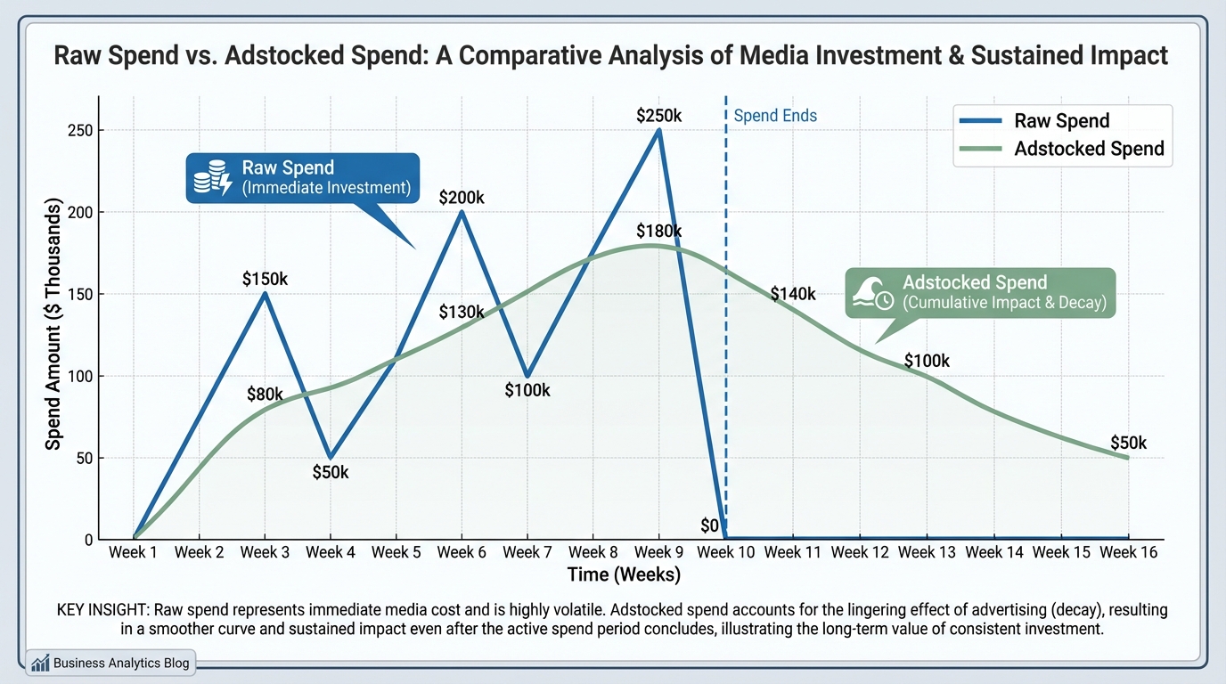 Adstock transformation quantifies this delayed reaction. It applies a mathematical formula to your marketing spend to estimate how much "media pressure" exists in the market on any given day, based on past spending.