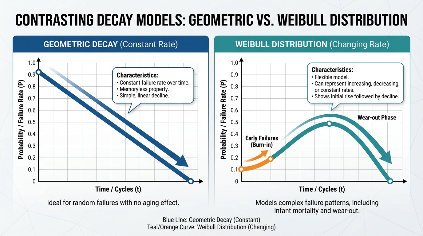 [IMAGE: Diagram contrasting Geometric Decay vs. Weibull Distribution curves. Geometric goes straight down. Weibull goes up slightly then curves down.]