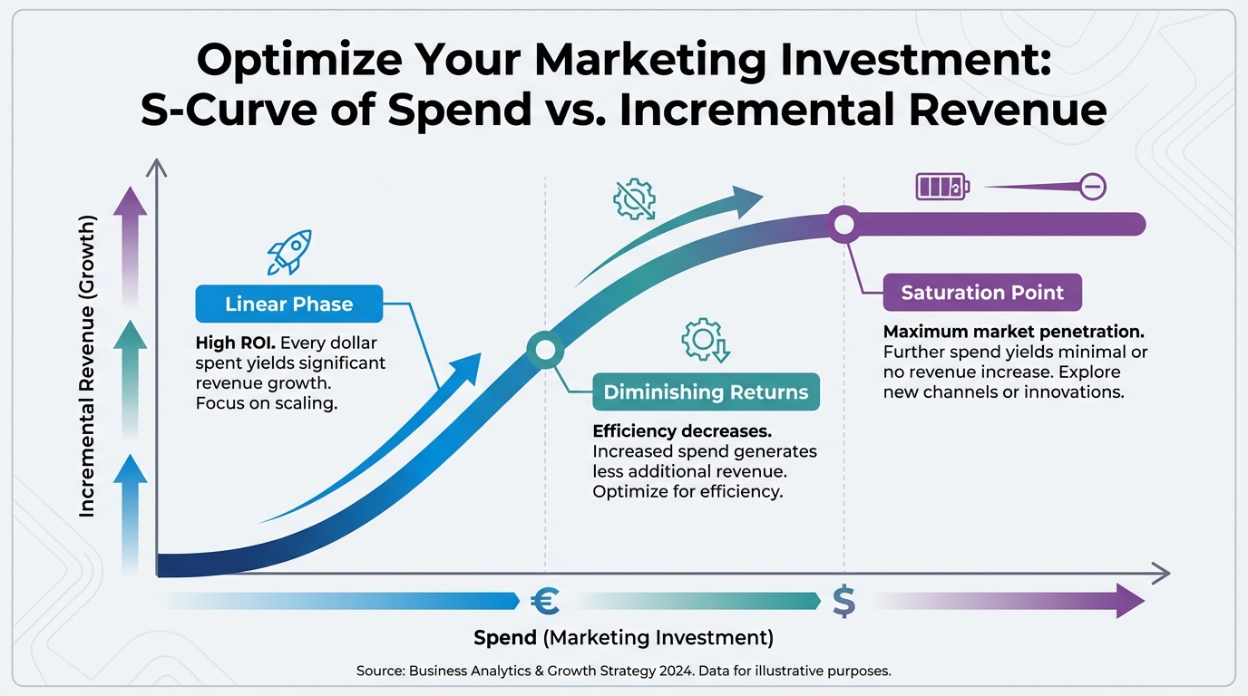 [IMAGE: S-Curve chart showing Spend (X-axis) vs. Incremental Revenue (Y-axis). Labels for 'Linear Phase', 'Diminishing Returns', and 'Saturation Point'.]