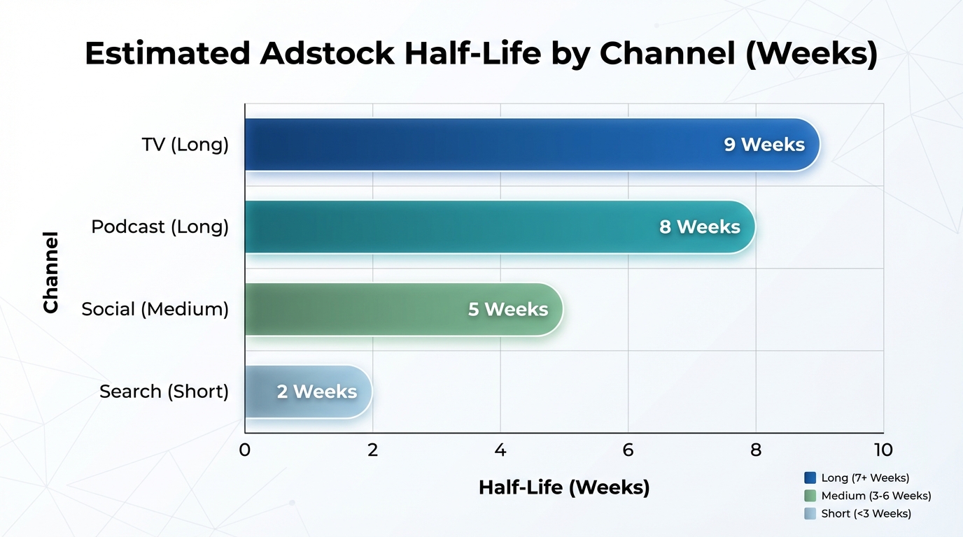 [IMAGE: Bar chart showing estimated adstock half-life in weeks for different channels: TV (Long), Search (Short), Social (Medium), Podcast (Long).]