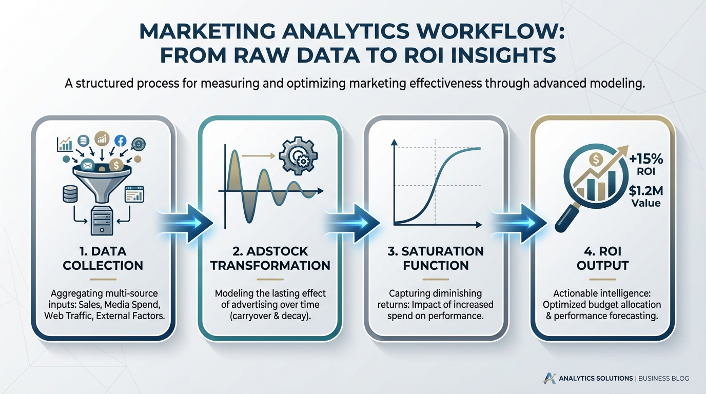 [IMAGE: Infographic showing the workflow: Data Collection -> Adstock Transformation -> Saturation Function -> ROI Output.]