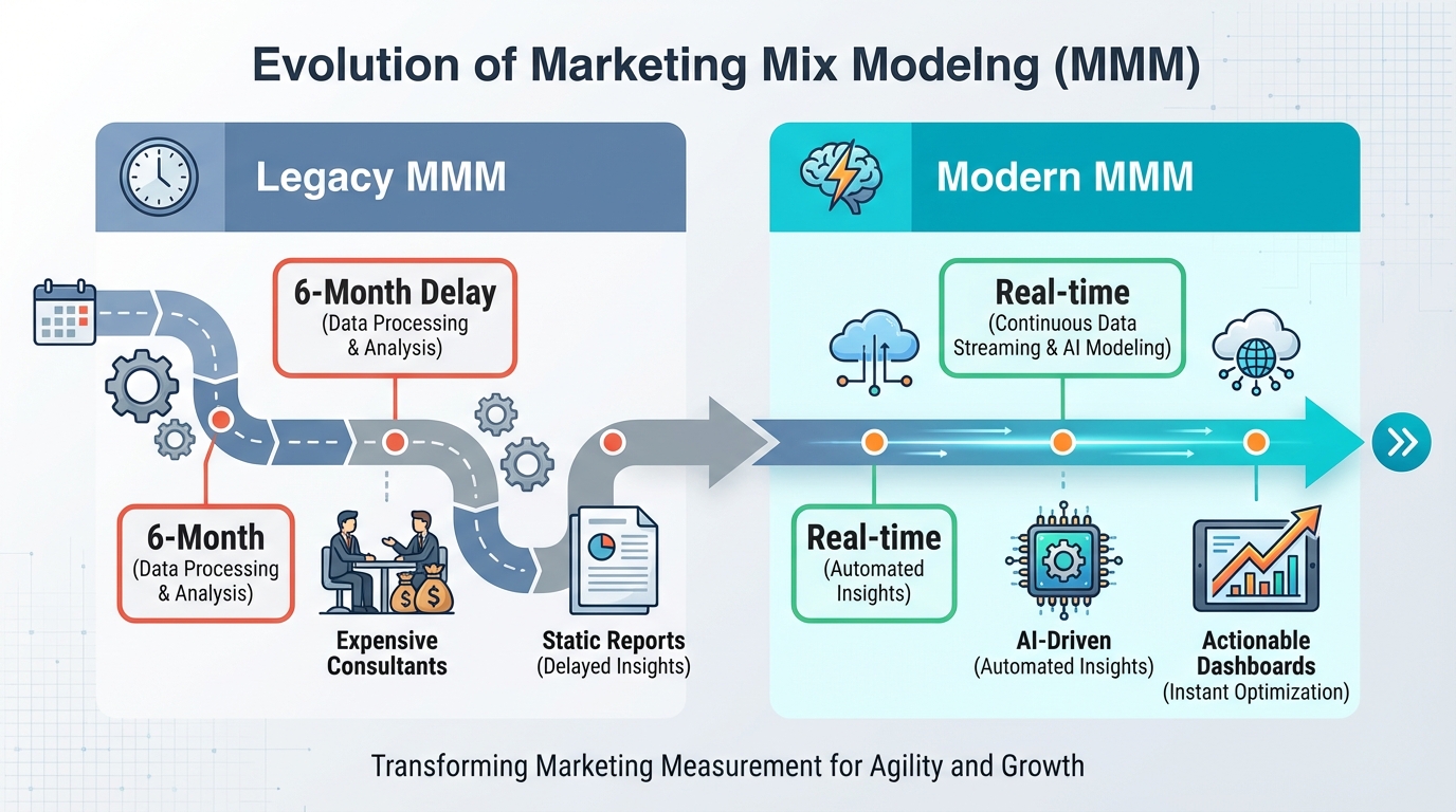 [IMAGE: A timeline graphic. Left side: "Legacy MMM" (6-month delay, expensive consultants). Right side: "Modern MMM" (Real-time, AI-driven, actionable dashboards).]