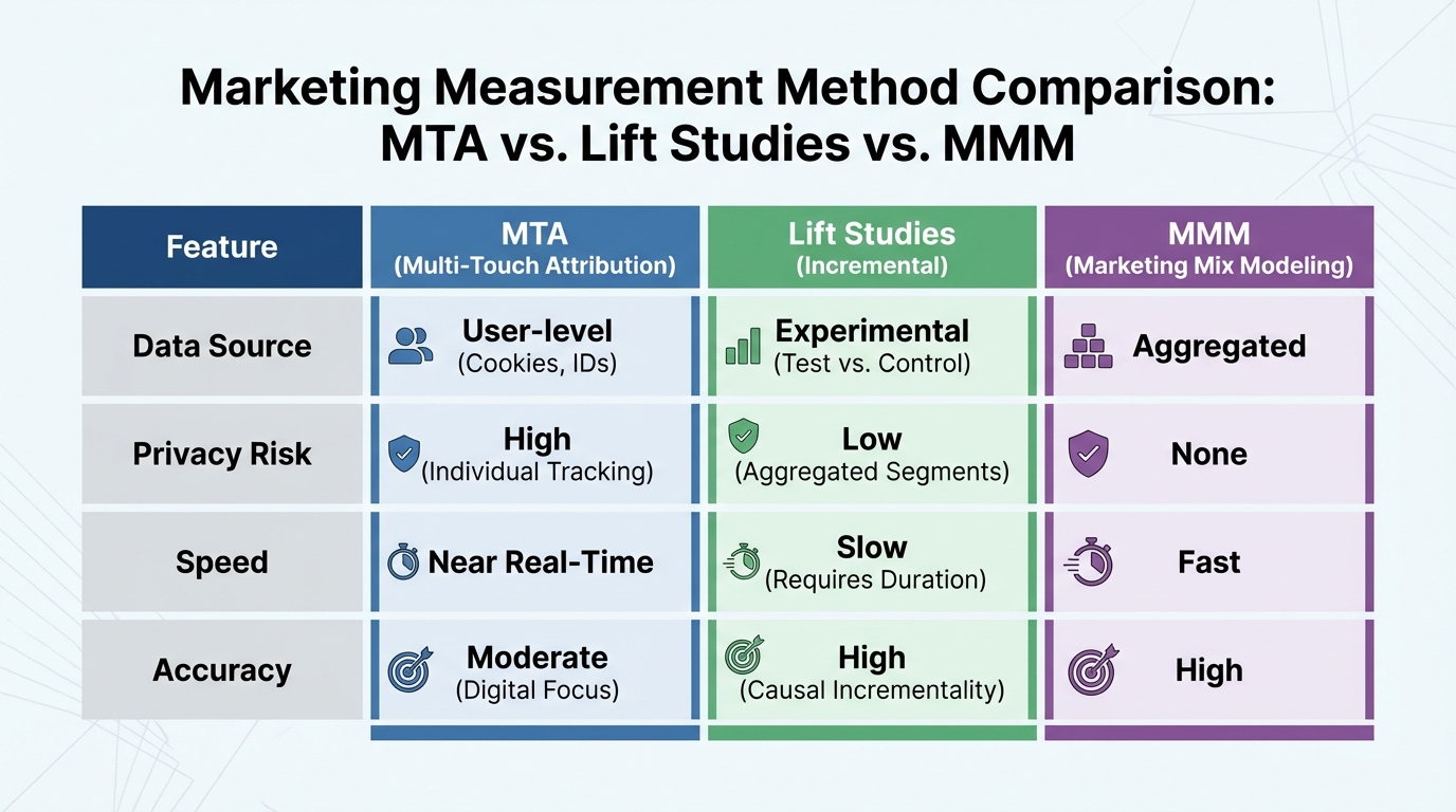 Alt text: Comparison table of MTA, Lift Studies, and MMM attribution models.