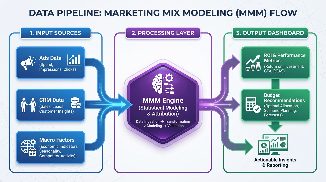 [IMAGE: A flowchart showing the data pipeline. Input sources (Ads, CRM, Macro factors) -> Processing Layer (MMM Engine) -> Output Dashboard (ROI, Budget Recommendations).]