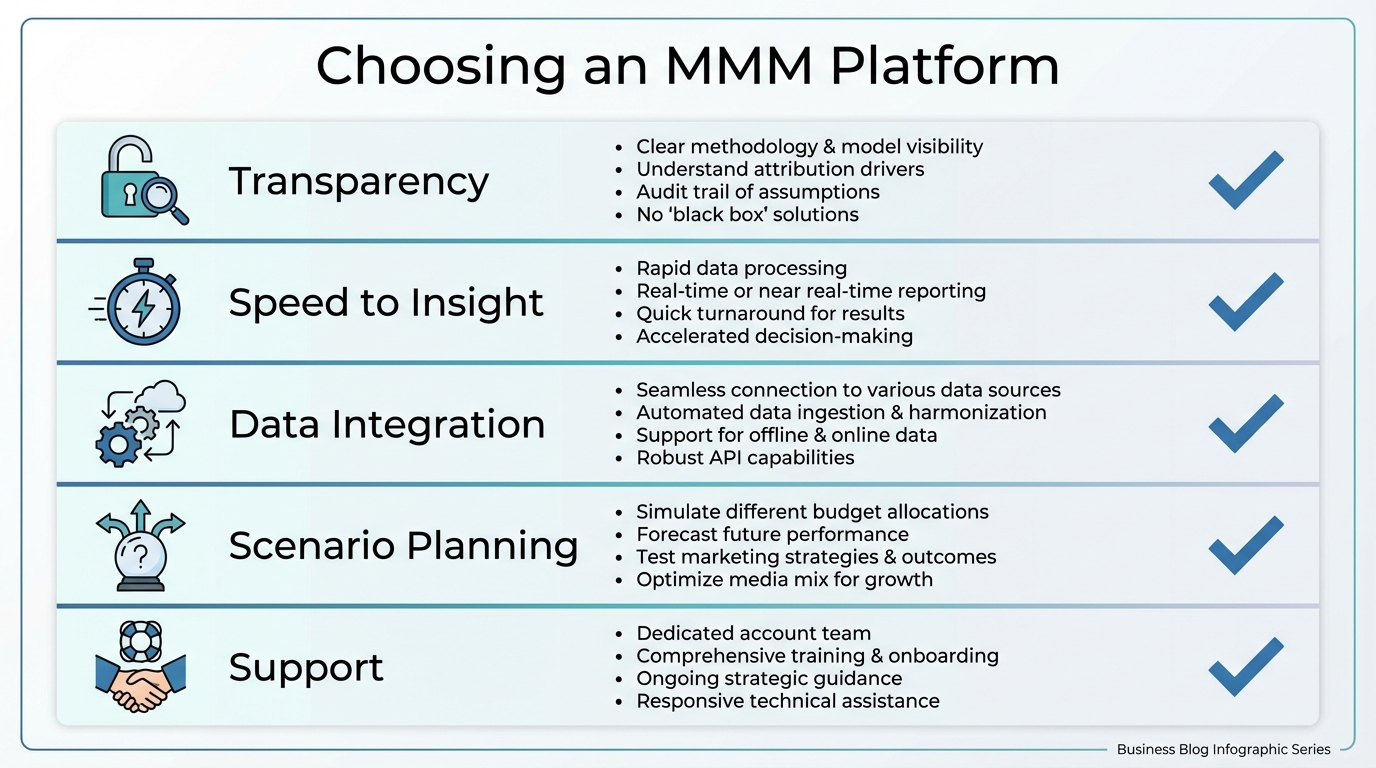 [IMAGE: A checklist graphic titled "Choosing an MMM Platform." Items include: Transparency, Speed to Insight, Data Integration, Scenario Planning, and Support.]