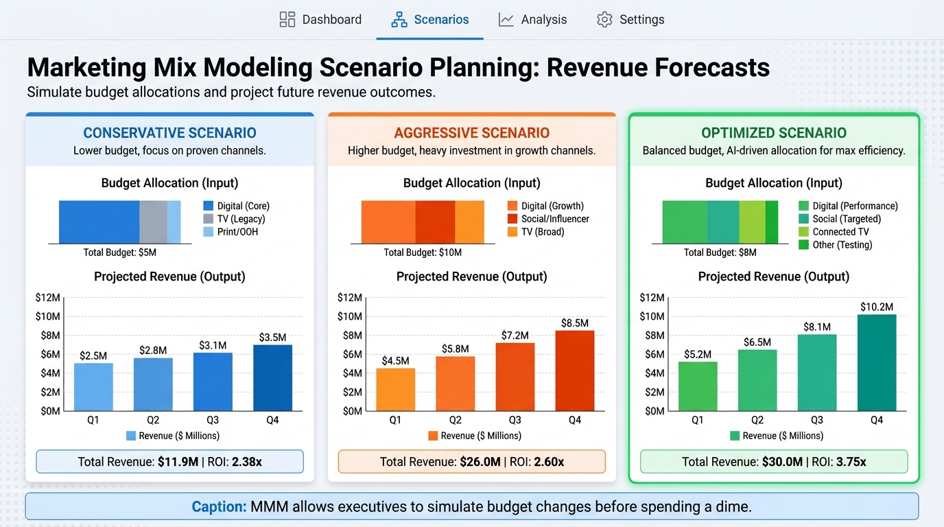 This is the fear-based motivator. MMM allows for forecasting. You can run scenarios: "If we cut brand spend by 20% in Q3, our model predicts a 12% drop in baseline sales in Q4."