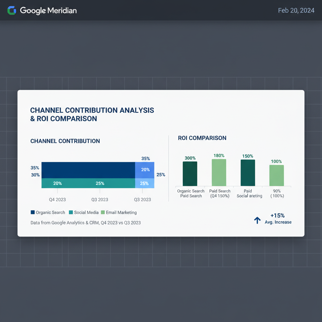 !Google Meridian channel ROI analysis dashboard showing marketing mix model results