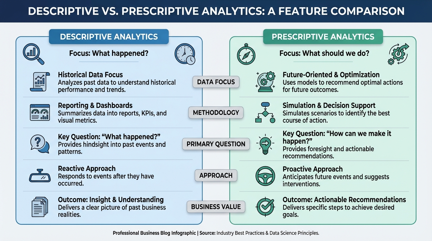 [IMAGE: A comparison table showing "Descriptive Analytics" vs "Prescriptive Analytics" features.]