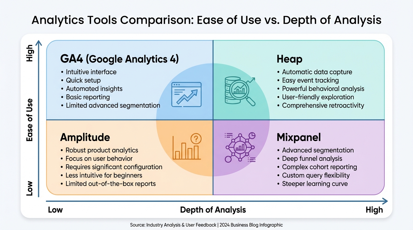 When deciding between Google Analytics 4 vs Mixpanel or Heap vs Amplitude, the decision often comes down to your engineering resources. If you have zero dev time, Heap is the winner. If you have a data team, Amplitude offers the most power.