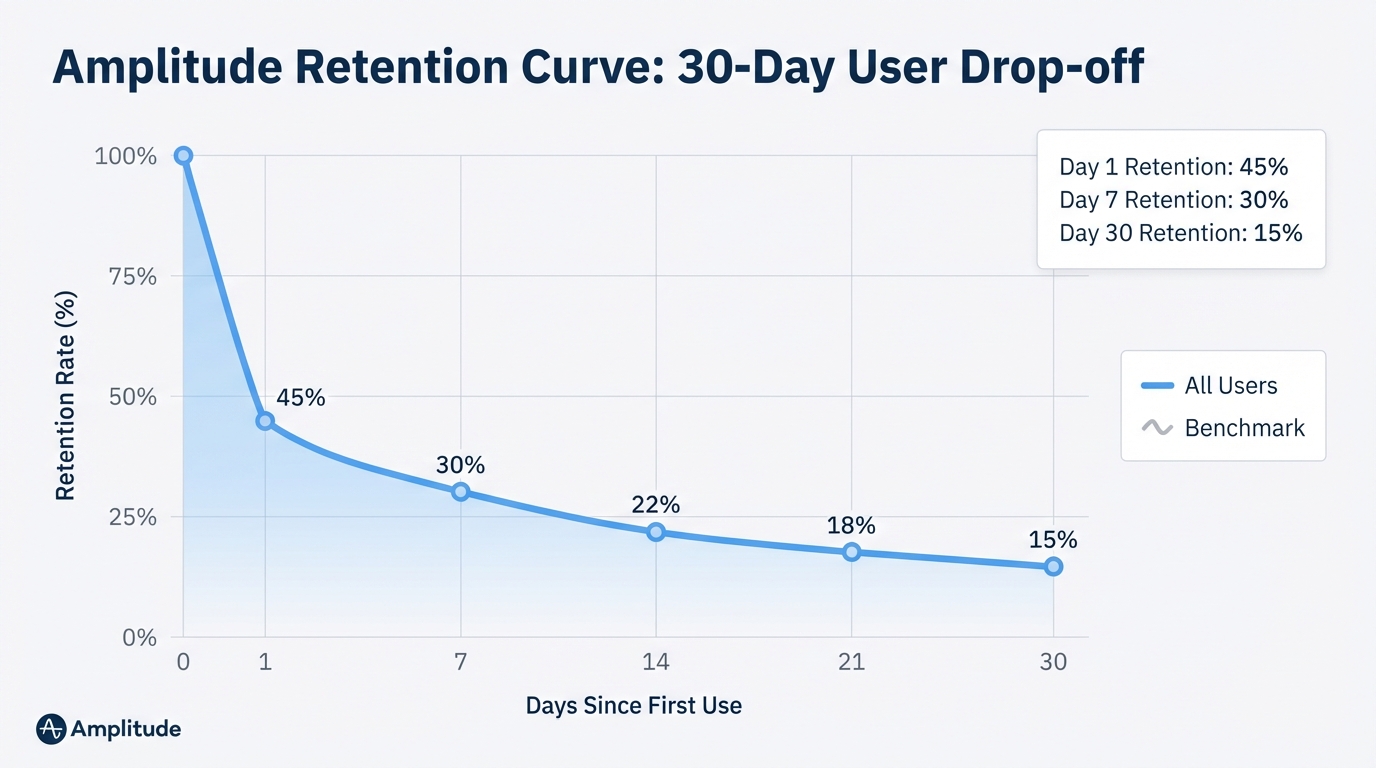 [IMAGE: Screenshot of an Amplitude retention curve chart showing user drop-off over 30 days.]