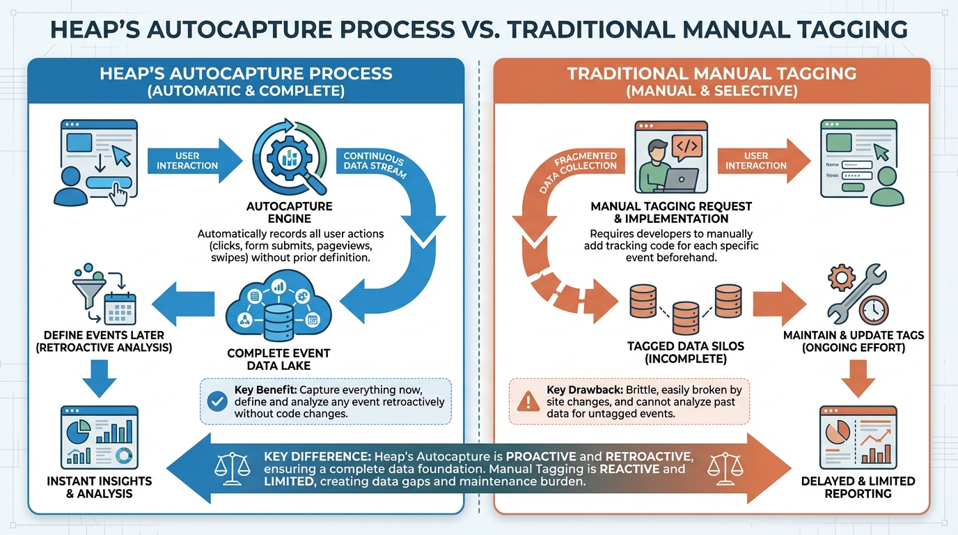 !Diagram illustrating Heap's autocapture process vs. traditional manual tagging.