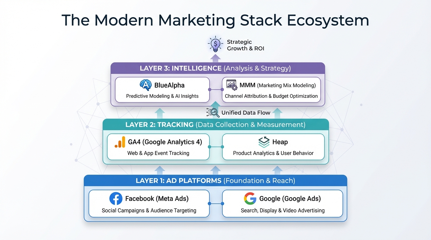 [IMAGE: Infographic showing the marketing stack ecosystem. Layer 1: Ad Platforms (FB, Google). Layer 2: Tracking (GA4, Heap). Layer 3: Intelligence (BlueAlpha/MMM).]