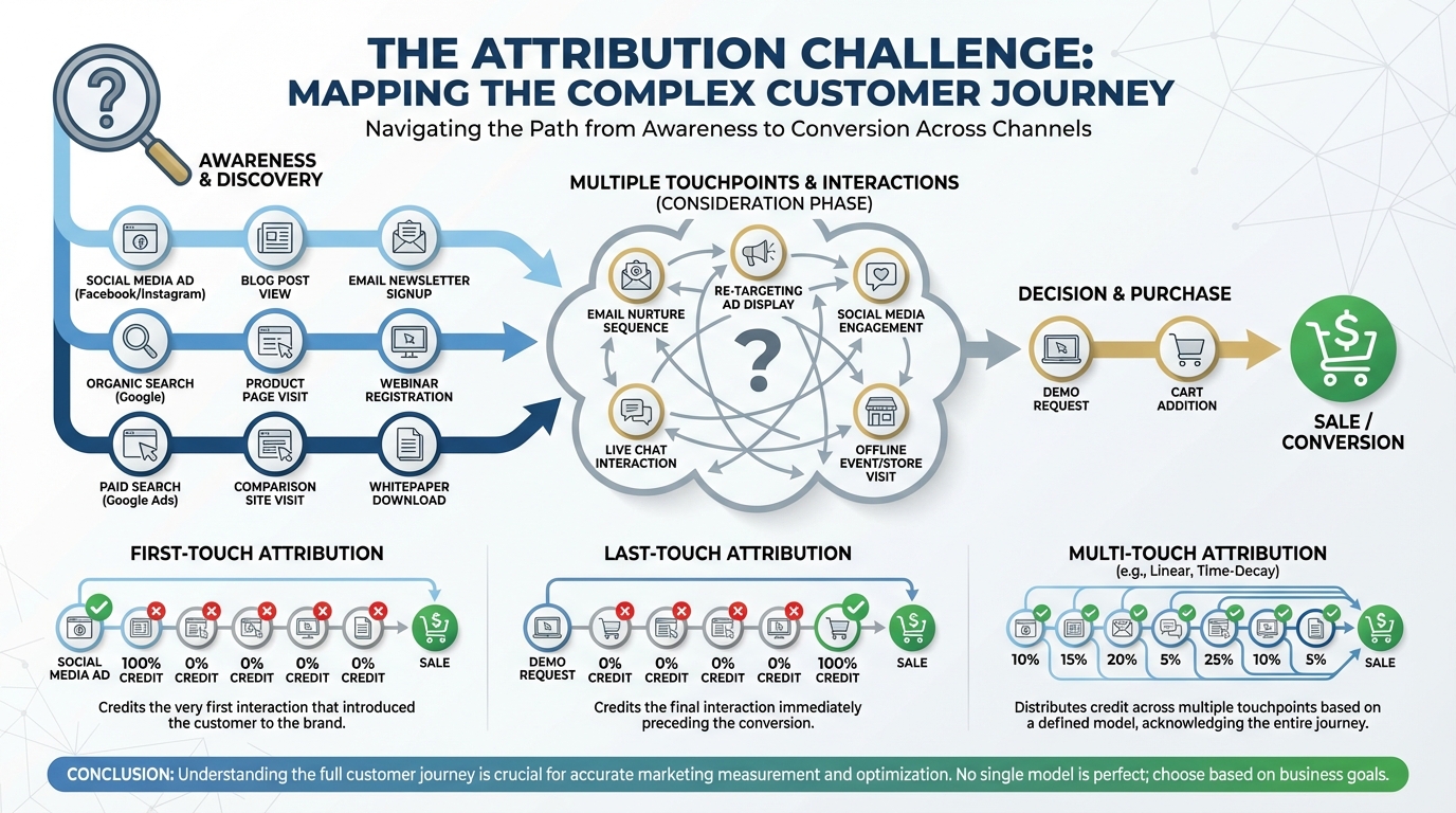 Multi-touch attribution (MTA) attempts to look at the whole picture. It acknowledges that a customer might hit 7, 10, or 20 touchpoints before buying. This requires sophisticated customer journey mapping to visualize every interaction a user has with your brand.