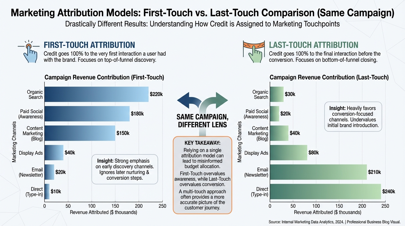 [IMAGE: Bar chart comparing First-Touch vs. Last-Touch attribution for the same campaign, showing drastically different results.]