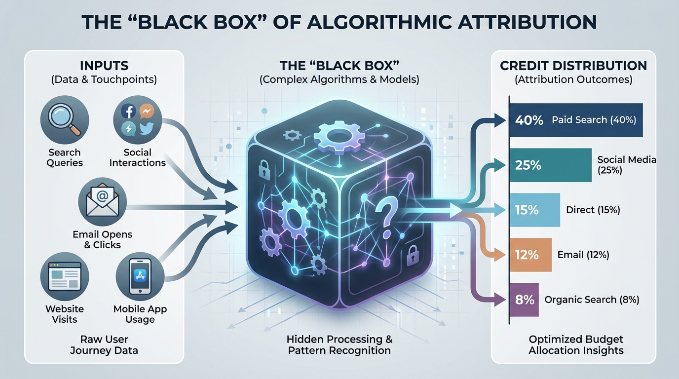 [IMAGE: Infographic illustrating the "Black Box" concept of algorithmic attribution, showing inputs entering a box and credit distribution coming out.]