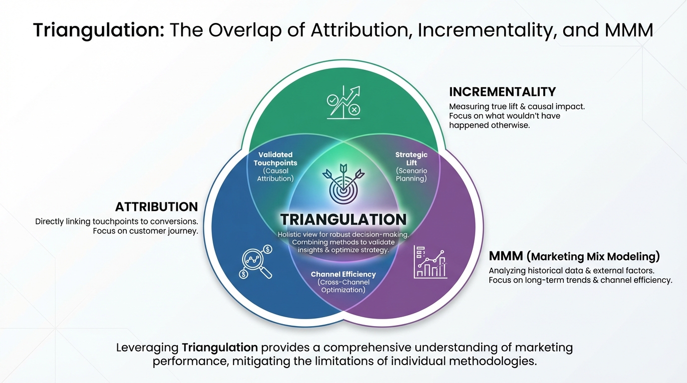 [IMAGE: Venn diagram showing the overlap of Attribution, Incrementality, and MMM, labeled "Triangulation".]