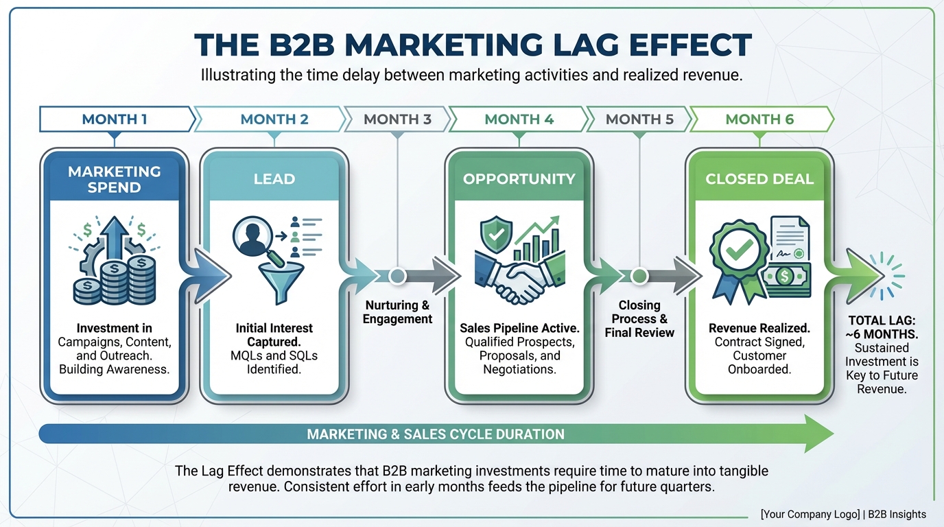 [IMAGE: Timeline diagram illustrating the "Lag Effect" in B2B. Show marketing spend in Month 1, Lead in Month 2, Opportunity in Month 4, and Closed Deal in Month 6.]