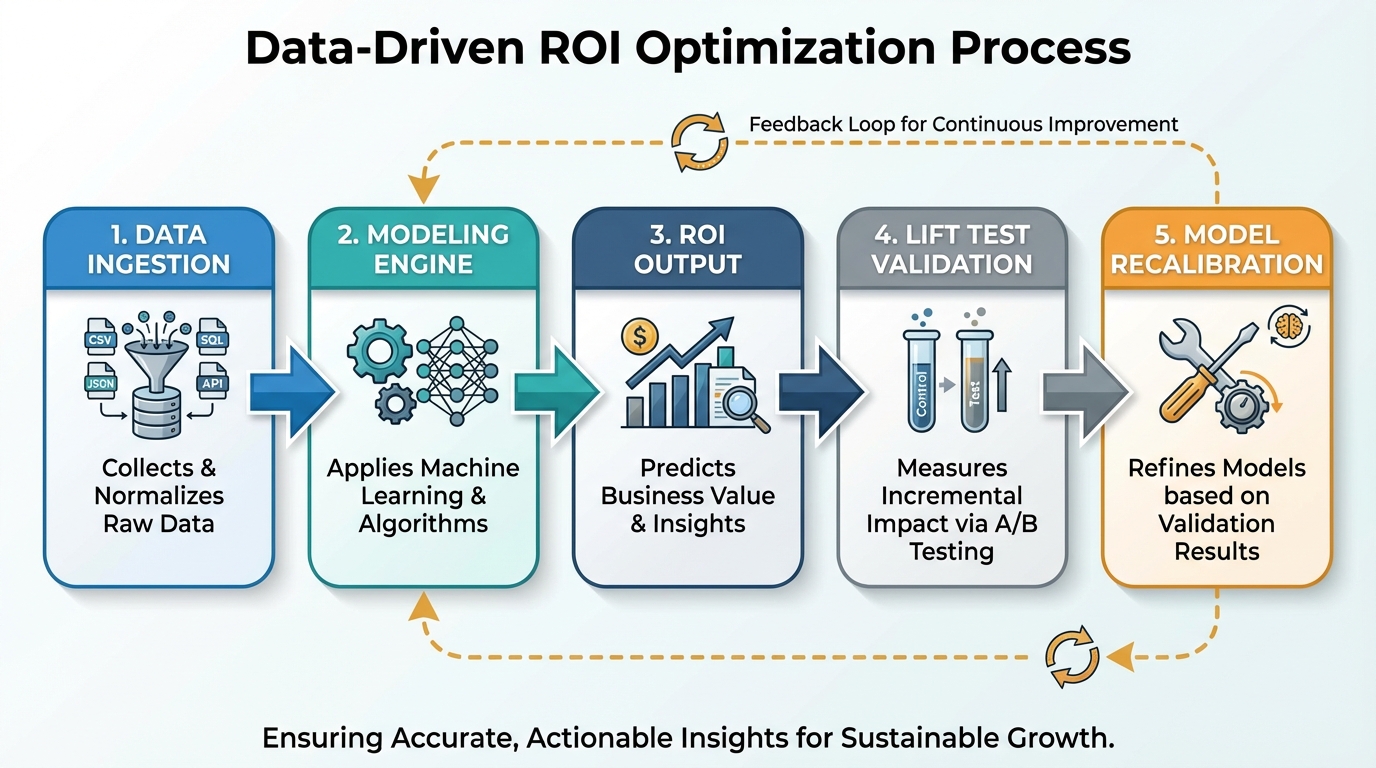 [IMAGE: Process flowchart: Data Ingestion -> Modeling Engine -> ROI Output -> Lift Test Validation -> Model Recalibration.]