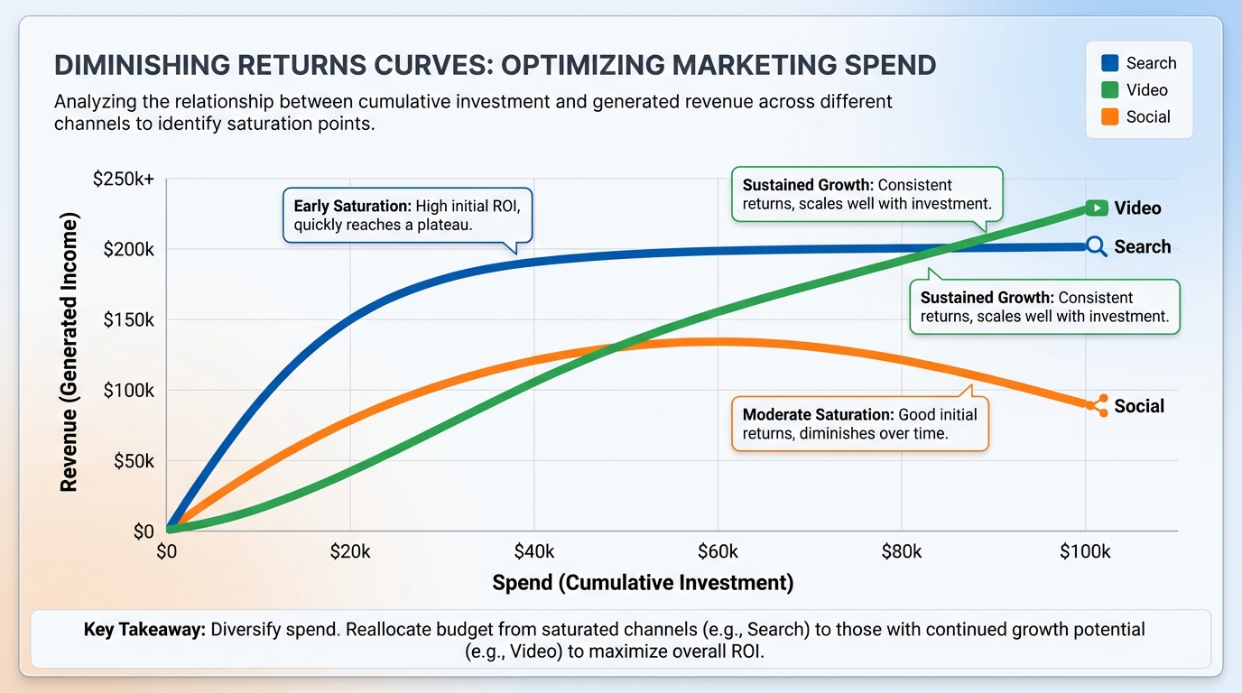 [IMAGE: Graph showing "Diminishing Returns Curves." X-axis is Spend, Y-axis is Revenue. Three lines for three channels. One line flattens out early (Search), one keeps rising (Video).]