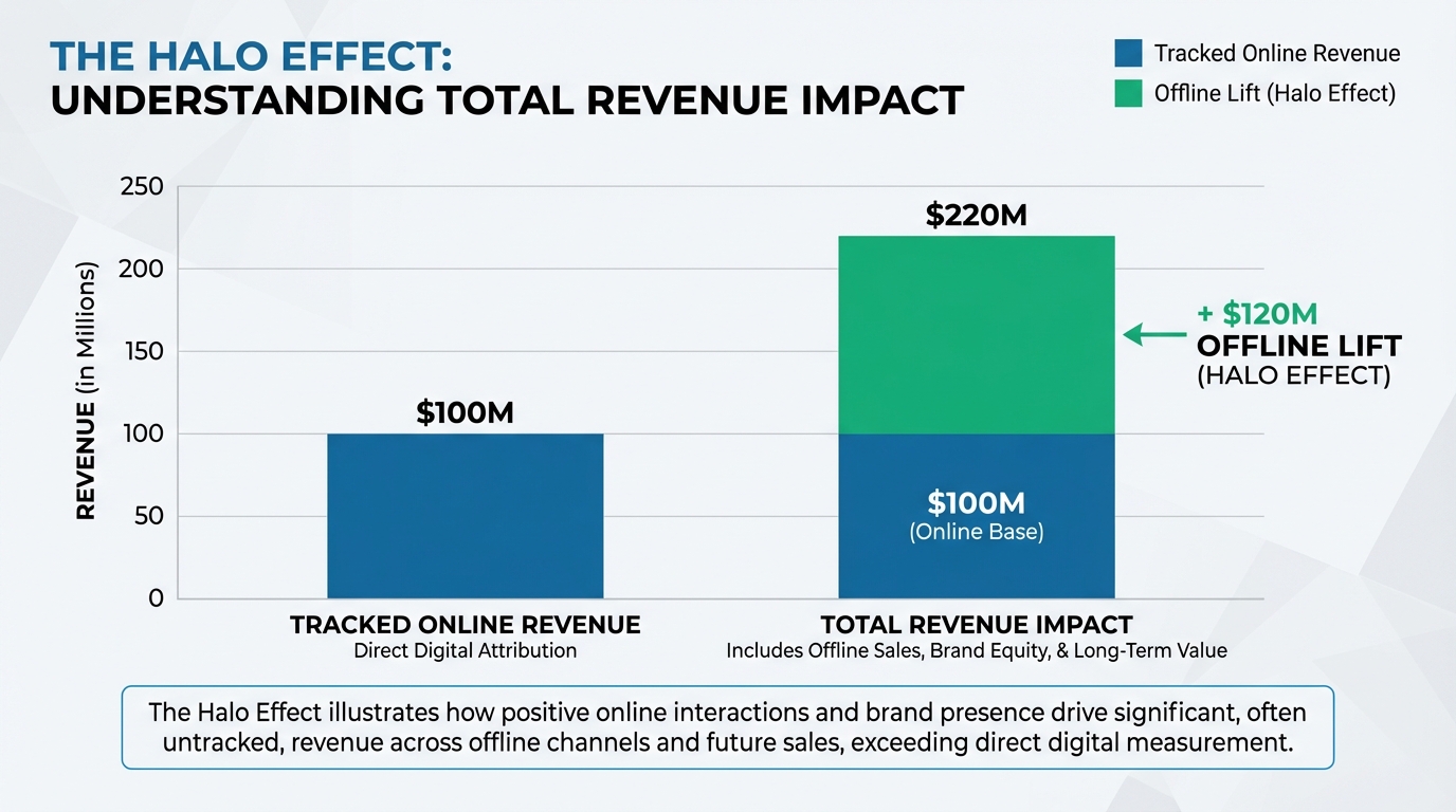 [IMAGE: Bar graph illustrating the Halo Effect. One bar shows 'Tracked Online Revenue', a second larger bar shows 'Total Revenue Impact' including offline lift.]