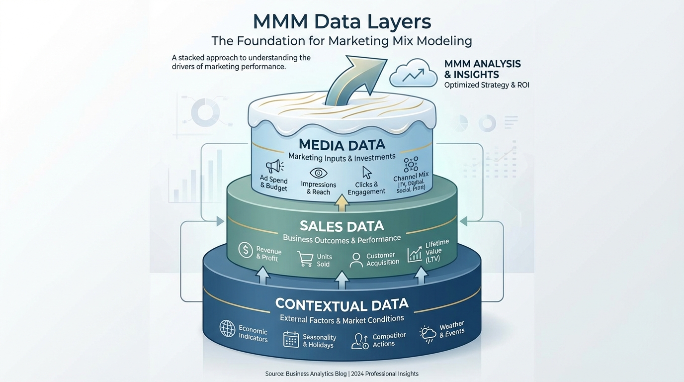 [IMAGE: Infographic showing the layers of data required for MMM: Media Data, Sales Data, and Contextual Data stacked like a cake.]