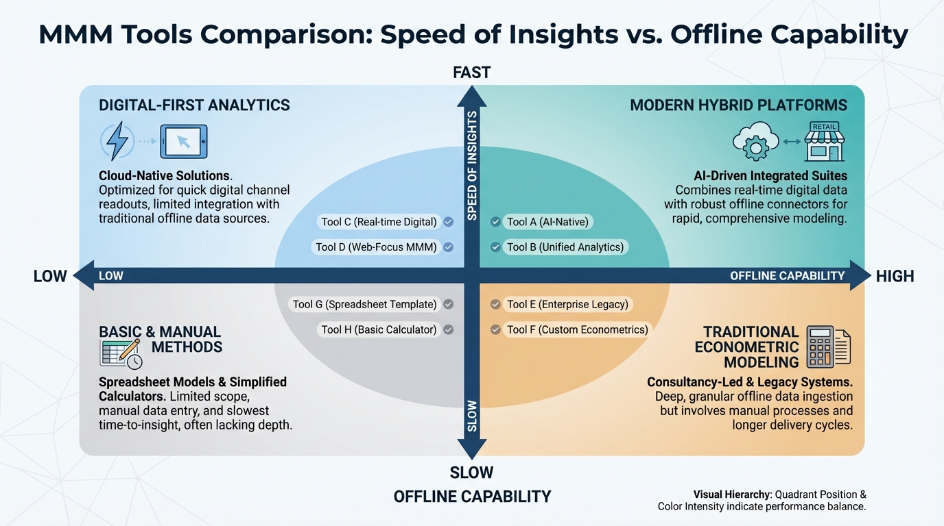 [IMAGE: Matrix chart comparing different MMM tools based on 'Speed of Insights' vs 'Offline Capability'.]