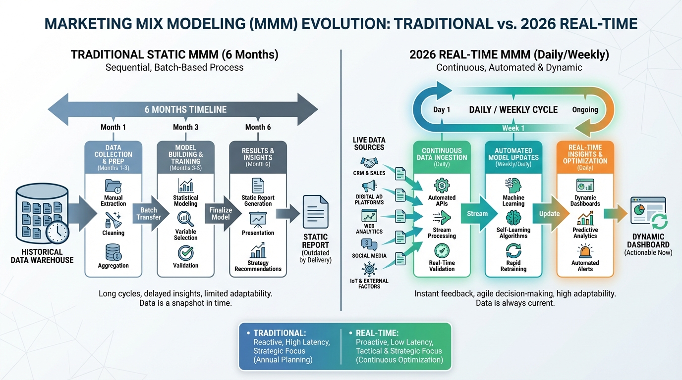 !Comparison of traditional static marketing mix modeling versus real-time continuous calibration.*