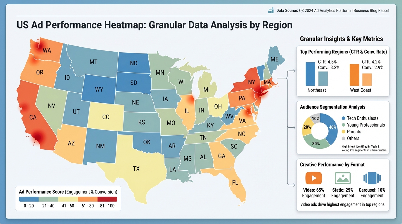 [IMAGE: A map visualization showing heatmaps of ad performance by specific US states or regions, highlighting granular data analysis.]