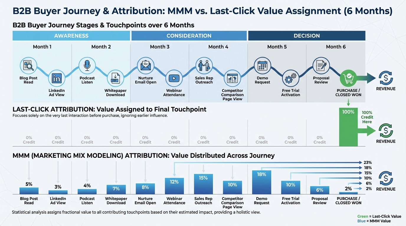 [IMAGE: Infographic showing the B2B buyer journey with touchpoints over 6 months, highlighting where MMM assigns value compared to last-click.]