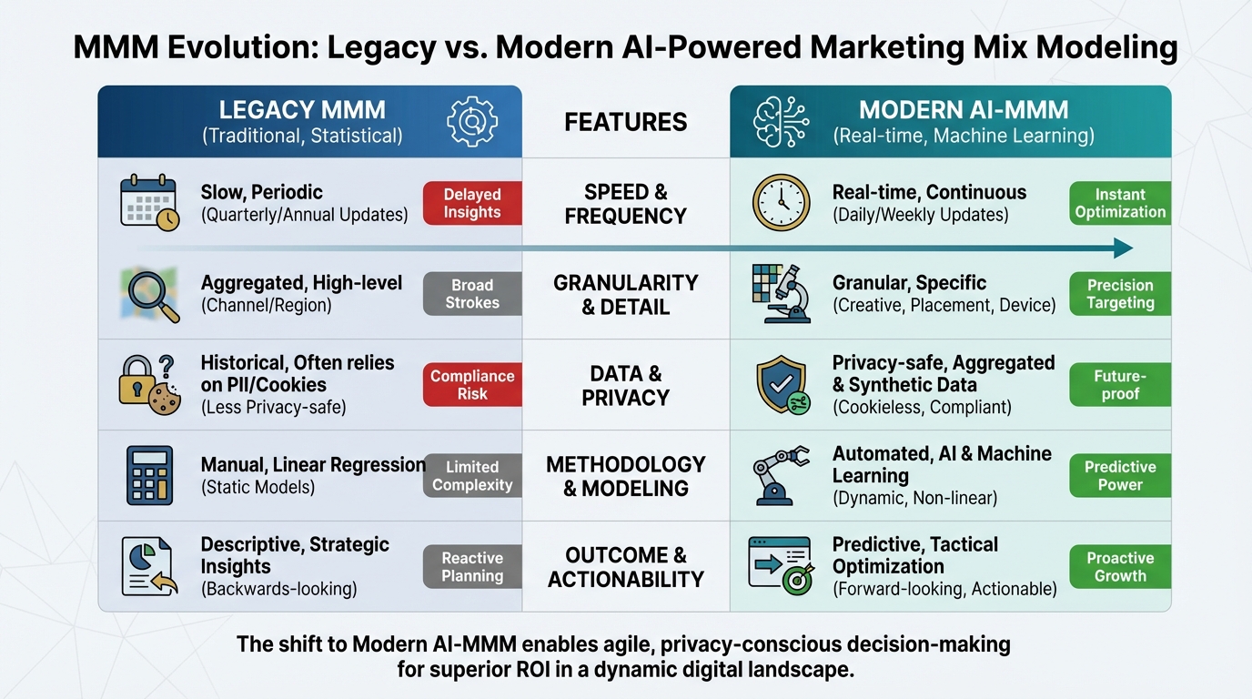 [IMAGE: A comparison chart listing features of Legacy MMM vs. Modern AI-MMM (Real-time, Granular, Privacy-safe, etc.).]