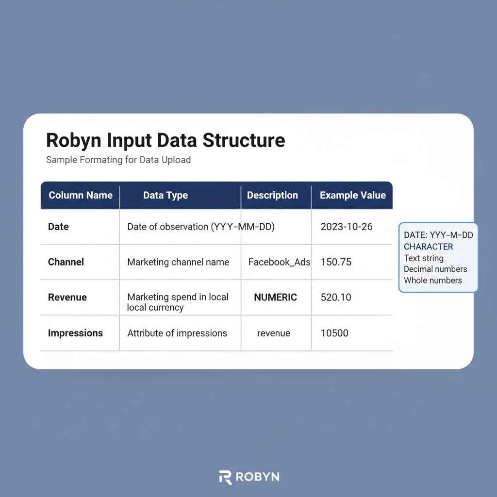 Before running Robyn, you need structured historical data. The minimum requirements include: