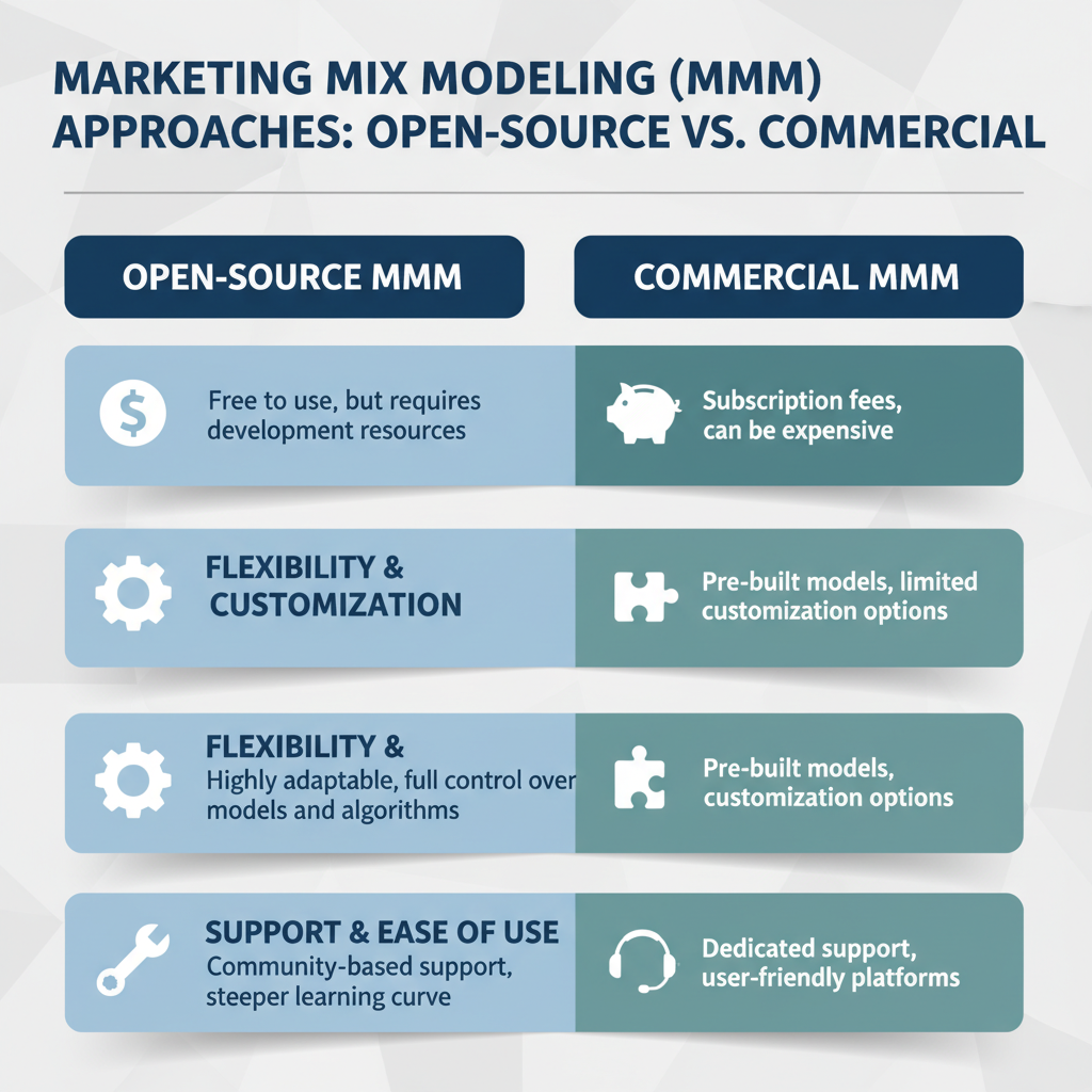 The tradeoff is cost and customization flexibility. Open-source gives you complete control. Commercial platforms give you speed and support. For a detailed breakdown of your options, see our comprehensive MMM comparison guide.