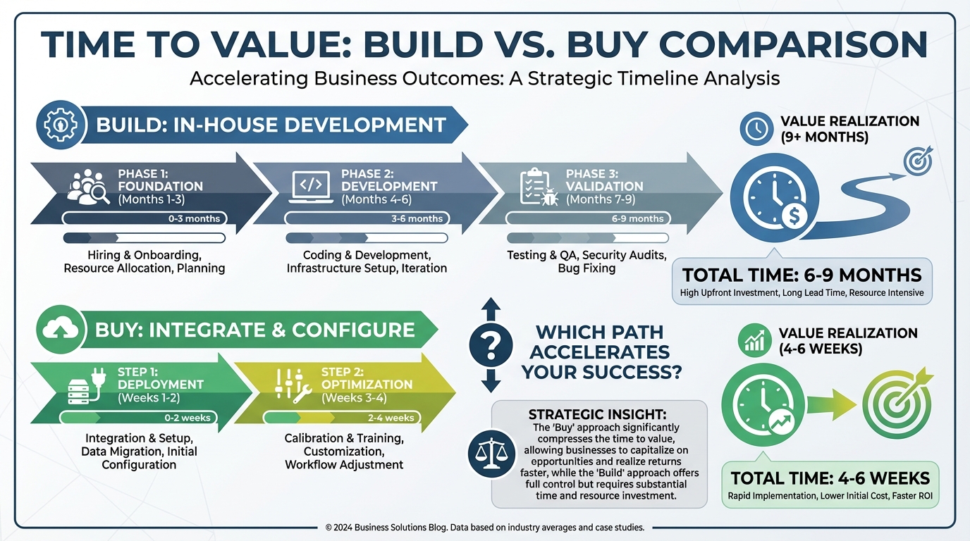 A typical in-house build takes 6 to 9 months to reach a production-ready state. This includes hiring talent, cleaning data, building the model, validating results, and creating dashboards. In contrast, buying a solution usually takes 4 to 8 weeks to deploy.