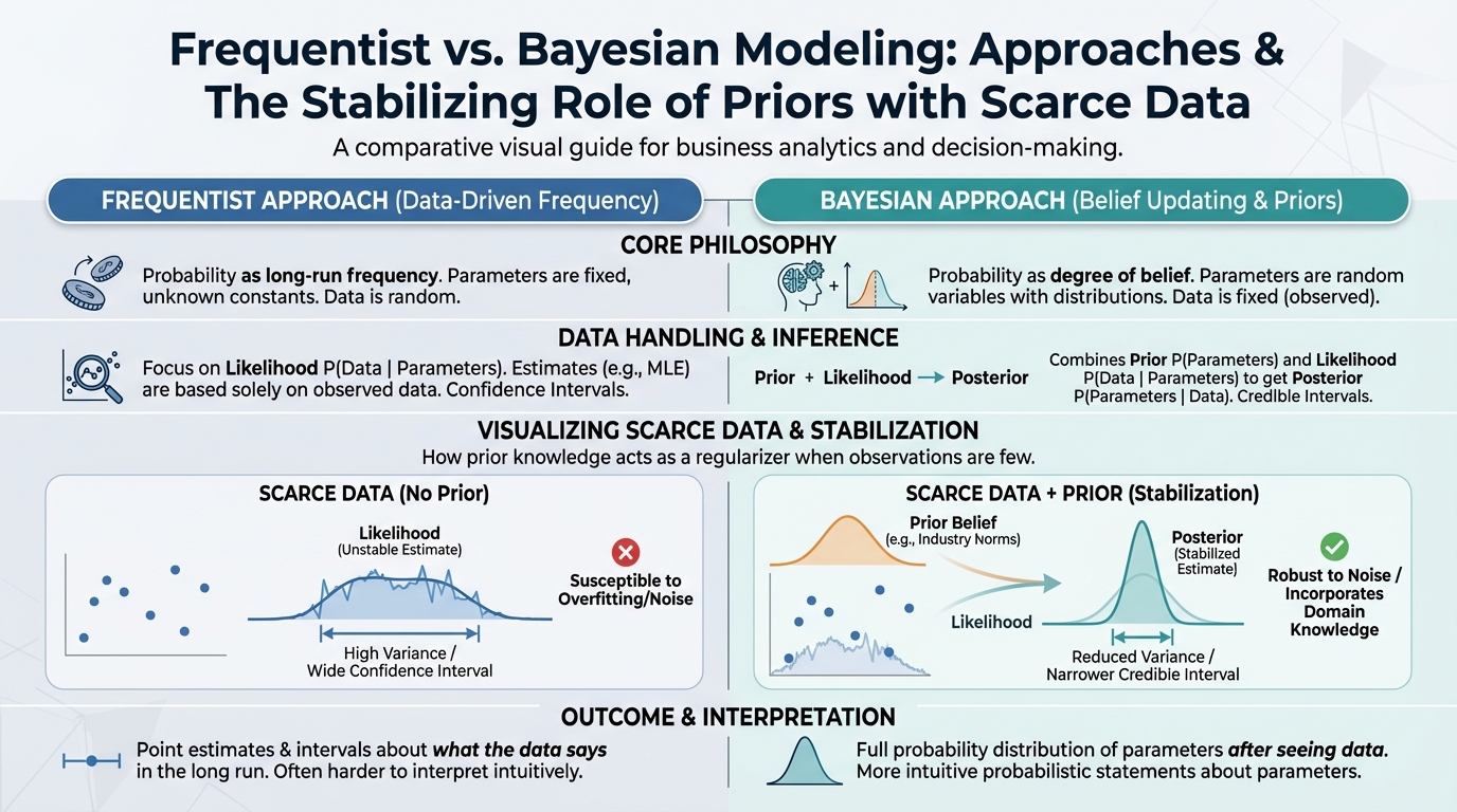 In frequentist statistics (the standard kind), you let the data speak entirely for itself. That sounds great until you have a small dataset or noisy signals. If you only have two years of weekly data, a standard regression model might tell you that spending $0 on Facebook is optimal because of one bad month.