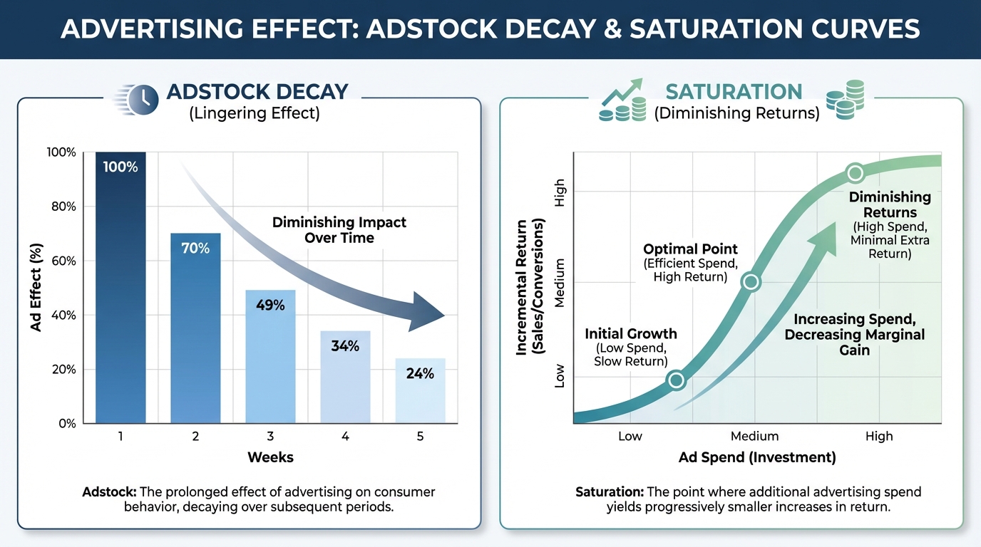 [IMAGE: Diagram illustrating Adstock decay and Saturation curves. Left side: Bar chart showing ad effect lingering over weeks. Right side: S-curve showing diminishing returns.]