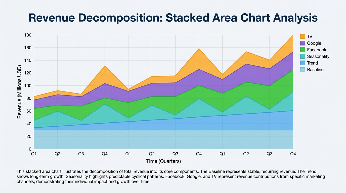 [IMAGE: Stacked area chart showing revenue decomposition. Layers for Baseline, Trend, Seasonality, Facebook, Google, and TV.]