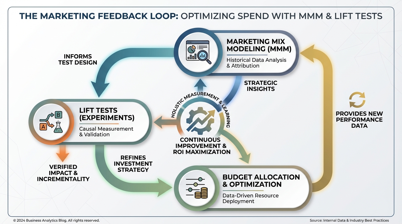 [IMAGE: Process diagram showing the feedback loop between MMM, Lift Tests, and Budget Allocation.]