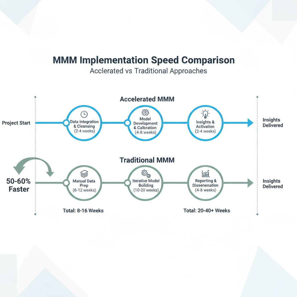 Modern MMM platforms reduce setup time from 6 months to 4-8 weeks through automation