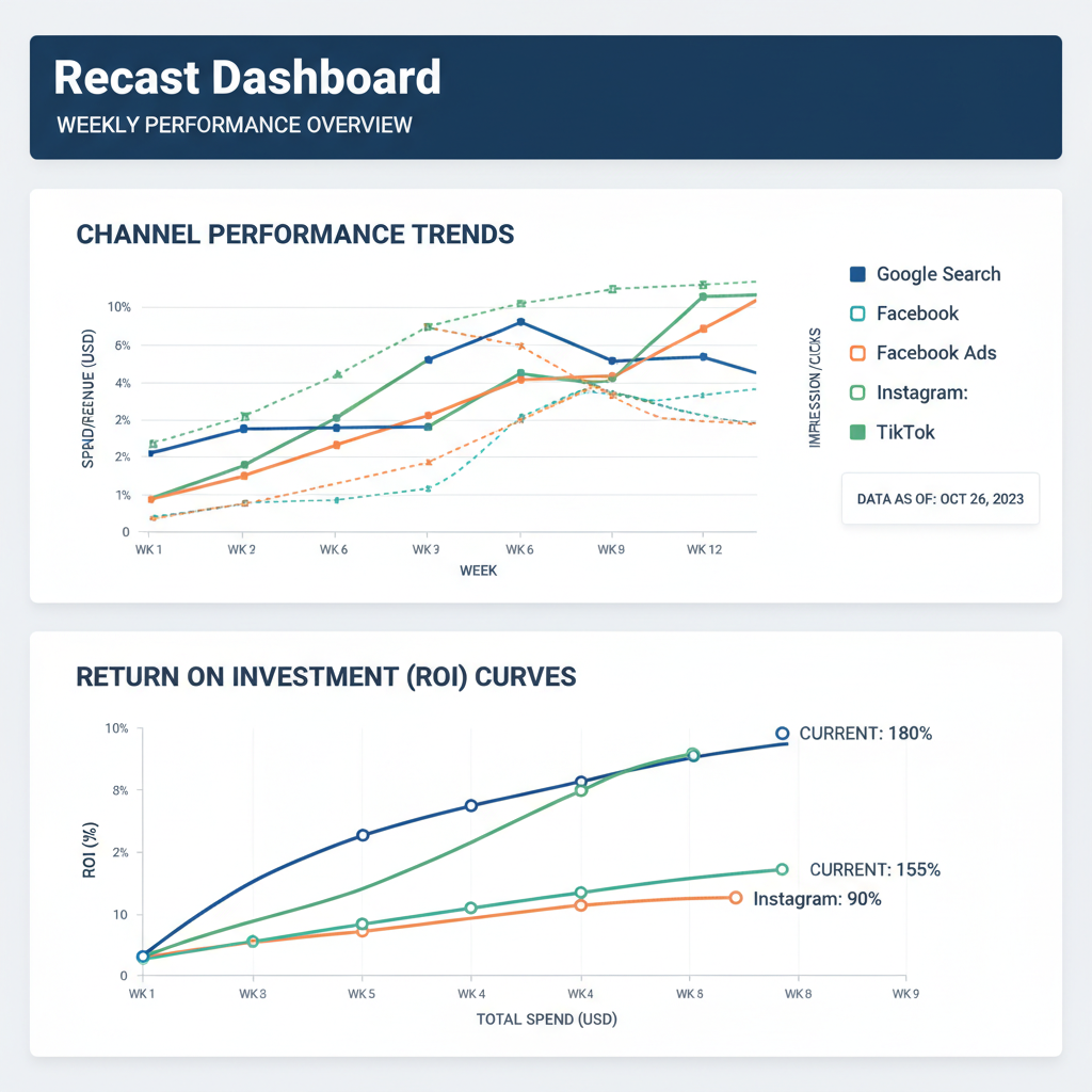 Recast includes optimization tools that recommend budget reallocations based on diminishing returns curves. The platform shows exactly where each additional dollar drives maximum incremental revenue.