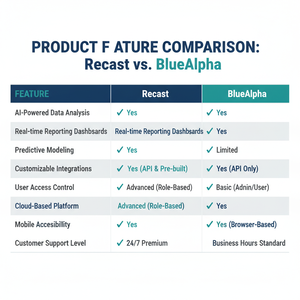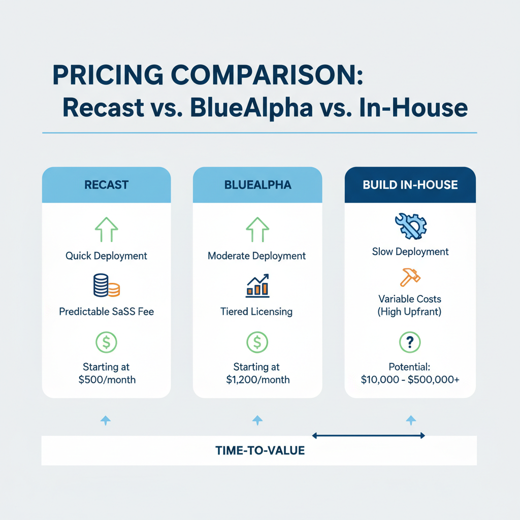 Choosing between Recast and BlueAlpha comes down to where you prioritize: proven enterprise reliability with transparent validation, or cutting-edge AI automation with rapid deployment.
