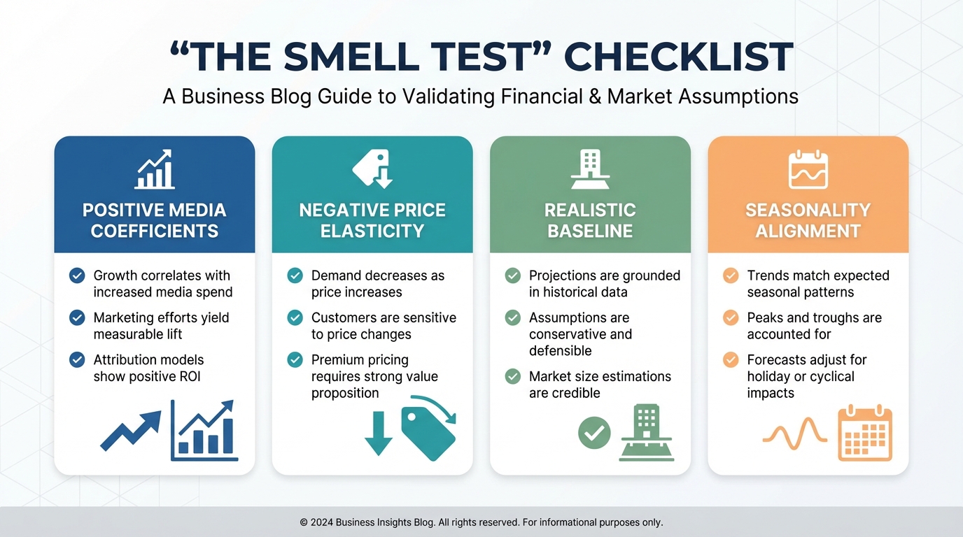 [IMAGE: Infographic showing "The Smell Test" checklist. Items include: Positive Media Coefficients, Negative Price Elasticity, Realistic Baseline, Seasonality Alignment.]