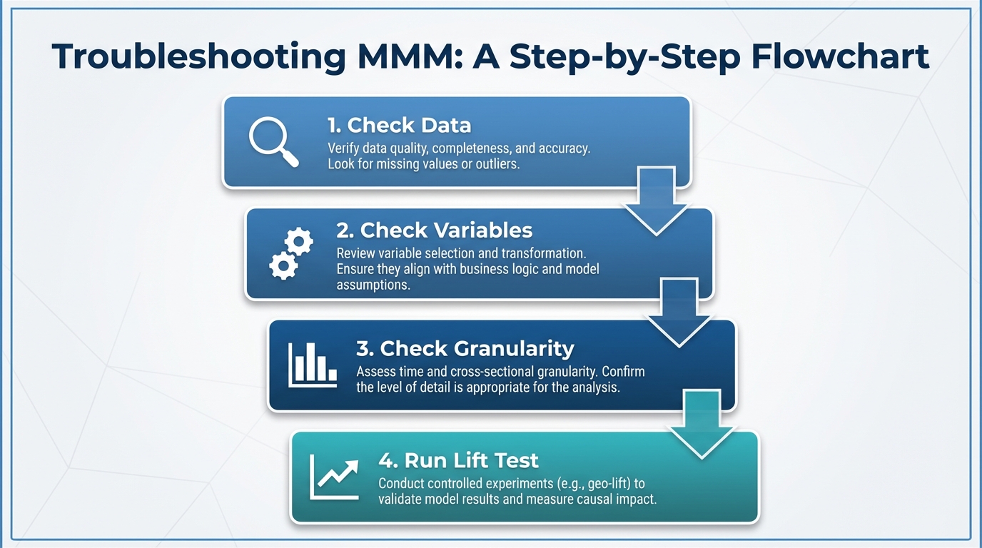 [IMAGE: Flowchart showing "Troubleshooting MMM". Steps: Check Data -> Check Variables -> Check Granularity -> Run Lift Test.]