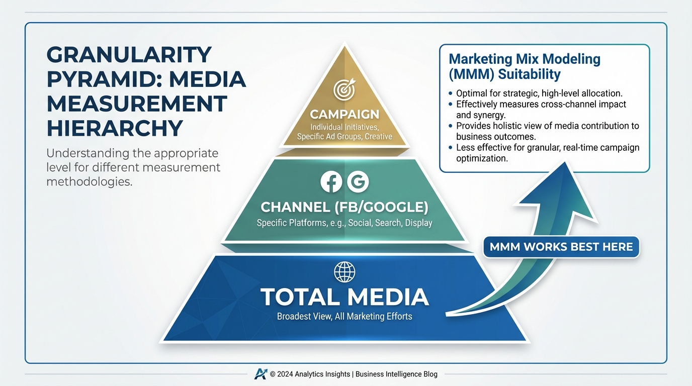 [IMAGE: Illustration of a "Granularity Pyramid". Base is "Total Media", middle is "Channel (FB/Google)", top is "Campaign". An arrow indicates MMM works best at the Base and Middle.]