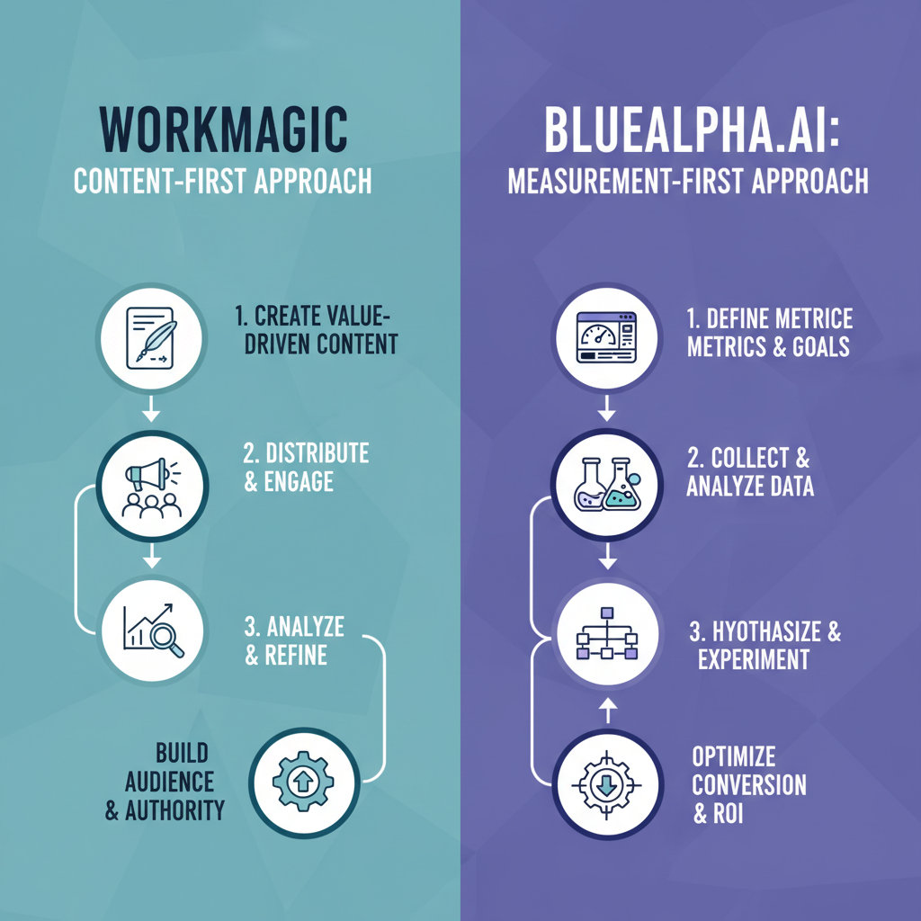 Workmagic vs BlueAlpha.ai represents a particularly interesting comparison because both platforms target similar audiences but approach the problem from opposite directions. One starts with content, the other starts with measurement. That distinction shapes everything.