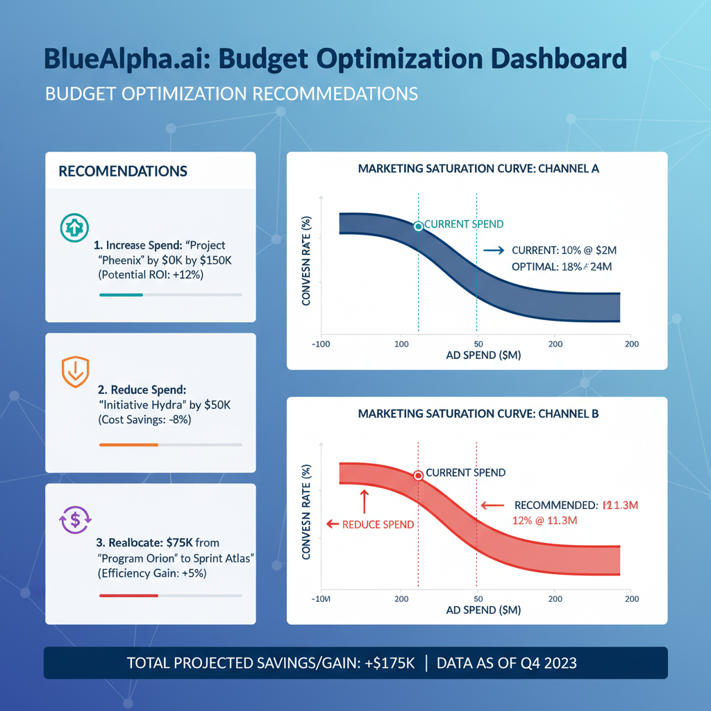 Budget Optimization Recommendations: Based on channel performance curves, BlueAlpha.ai recommends optimal budget allocation. This goes beyond reporting—it's prescriptive analytics that tell you where to invest next.